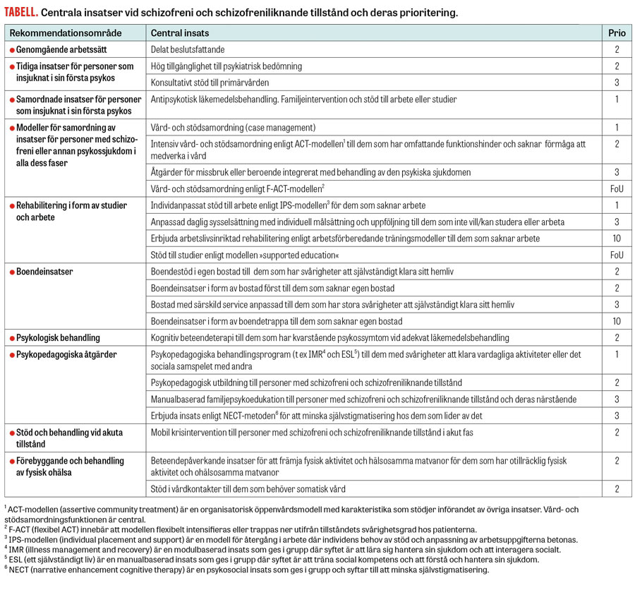 De insatser som har rankats högst (prio 1–3) bör tillhöra basutbudet av kommunala insatser och psykiatrisk öppenvård för patienter med psykossjukdom. Dit hör delat beslutsfattande, hög tillgänglighet till psykiatrisk bedömning och vård för nyinsjuknade, stöd i återgång i arbete, psykopedagogiska insatser och stöd i kontakter med övrig hälso- och sjukvård. Den samordnande kontaktpersonen kan ses som navet i planeringen av insatserna utifrån patientens behov och önskemål.
