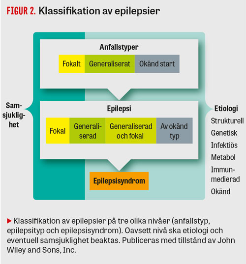 Anfallsklassifikationen bedömer bara symtomet, anfallet. Nästa nivå i klassifikationen avser patientens sjukdom, epilepsin. Här väger man in eventuell kombination av olika anfall och inte minst underliggande orsaker. Även epilepsiklassifikationen har förnyats, baserat på framsteg inom genetik, avbildning och neurofysiologi. Etiologi har därför fått en framträdande plats och ska alltid övervägas (Figur 2).