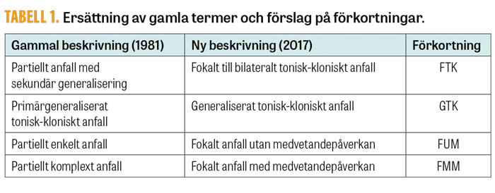 I Tabell 1 presenteras översättningar från den gamla till den nya klassifikationen och föreslagna förkortningar. Språkligt går det bra att utelämna ord som inte tillför information, och ordföljd saknar betydelse. Sålunda är ett hyperkinetiskt anfall fokalt och motoriskt, utan att detta behöver uttalas. På motsvarande sätt behöver starten preciseras vid exempelvis toniska anfall.