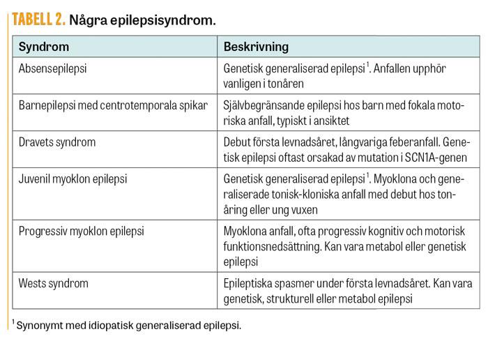 Baserat på mer information finns ibland möjlighet att diagnostisera ett specifikt epilepsisyndrom (Tabell 2) vid karakteristisk kombination av olika kliniska fenomen såsom anfallstyper, EEG- eller avbildningsfynd och debutålder. Identifieringen av syndrom kan ha betydelse för behandling och underlättar bedömning av prognos. Några väletablerade epilepsisyndrom presenteras i Tabell 2. Den mest kända gruppen utgörs av de idiopatiska generaliserade epilepsierna, vilka innefattar exempelvis juvenil myoklon epilepsi och absensepilepsi. Som alternativ till begreppet »idiopatisk generaliserad epilepsi« kan man enligt nya klassifikationen också använda »genetisk generaliserad epilepsi«.