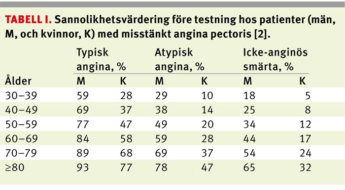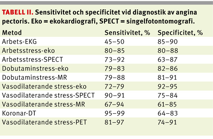 Sannolikhetsvärderingen före testning bygger fortfarande på symtomens karaktär (typisk angina, atypisk angina, icke-anginös smärta) och patientens ålder och kön. Grundtanken är att värderingen av sannolikheten för att en patient har stabil angina pectoris måste sättas i relation till de olika icke-invasiva testens sensitivitet och specificitet (Tabell II). Icke-invasiv testning kan göra skada om antalet falska testresultat är högre än antalet korrekta. Icke-invasiv bildbaserad diagnostik vid stabil angina pectoris har en sensitivitet runt 85 procent, varför 15 procent av resultaten kommer att vara falska. Detta innebär att inget test alls ger färre felaktiga diagnoser hos patienter med en sannolikhetsvärdering på <15 procent (förutsatt att alla patienter är friska) eller >85 procent (förutsatt att alla patienter är sjuka). I dessa situationer bör utredning bara startas om speciella skäl föreligger, enligt de nya riktlinjerna.
