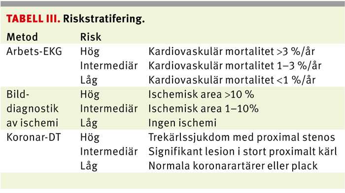 Principen för diagnostik har alltså modifierats betydligt och bygger på att man före testning värderar sannolikheten för att det är fråga om stabil angina pectoris (Tabell I). Om denna sannolikhetsvärdering är <15 procent rekommenderas att man söker efter andra orsaker till symtomen och överväger funktionell kranskärlssjukdom. Om sannolikhetsvärderingen är intermediär (15–85 procent) görs icke-invasivt test. Om sannolikhetsvärderingen är hög, >85 procent, anses diagnosen vara stabil angina pectoris, och man fortsätter då med riskstratifiering.