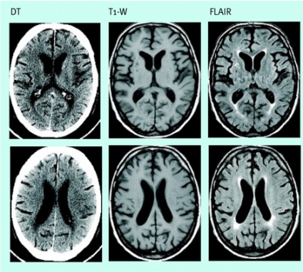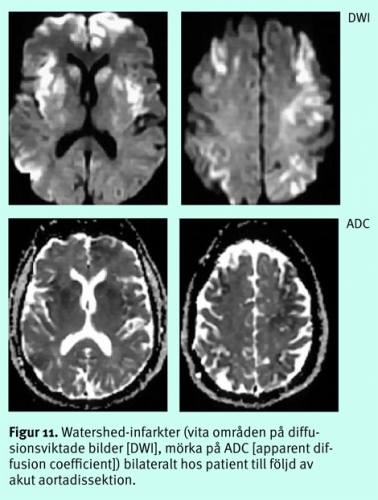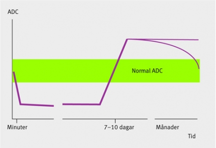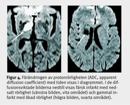 DWI-bilderna ger således hög kontrast och lämpar sig väl för att påvisa patologiska förändringar (Figur 3). Diffusionen låter sig också beräknas i absoluta tal som »apparent diffusion coefficient« (ADC). Sådana bearbetningar eliminerar effekterna av tex förhöjd T2-signal, som annars kan leda till misstolkningar, och gör att man kan skilja cytotoxiskt ödem från vasogent.