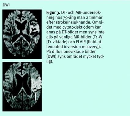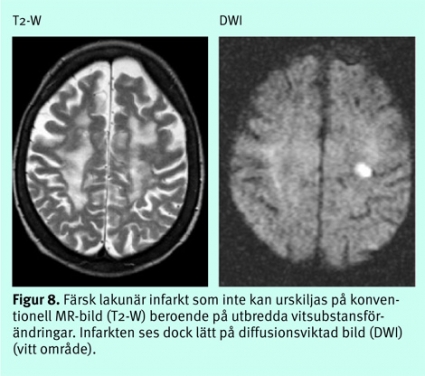 Diffusionsviktade MR-bilder (DWI), som framför allt avspeglar protonernas rörlighet i det extracellulära vattnet, har däremot mycket hög känslighet för det cytotoxiska ödemet. Cellsvullnaden orsakar en sekundär inskränkning av extracellulära rummet vid tidiga infarkter, och DWI kan påvisa sådana förändringar redan efter minuter. Sensitiviteten respektive specificiteten med DWI de första 6 timmarna efter infarktinsjuknandet anses vara i storleksordningen 95 procent respektive nära 100 procent [4], och känsligheten även för små lakunära infarkter är vida överlägsen känsligheten med DT.