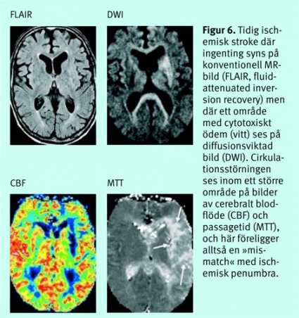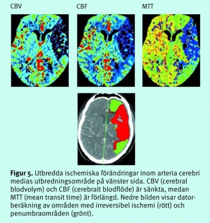Vid en cirkulationsstörning sker först en ökning av CBV för att kompensera för sänkt perfusionstryck (autoregulation). Vid ytterligare sänkt perfusionstryck sjunker CBF och därefter både CBV och CBF. Vid analysen görs i allmänhet en jämförelse med den friska sidan. Vid DT-perfusion kan penumbraområdet beräknas genom analys av graden av perfusionsstörning (Figur 5).Vid MR-perfusion används samma princip, men man kan där också illustrera penumbraområdet genom subtraktion från området med cirkulationsstörning av området med cytotoxiskt ödem på diffusionsviktade bilder. När man har en »mismatch«, dvs större vävnadsvolym med cirkulationsstörning än området med cytotoxiskt ödem, föreligger en situation där det finns vävnad (penumbra) som potentiellt kan räddas från vävnadsdöd (Figur 6).