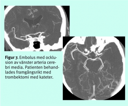 Den senaste tidens utveckling av DT-angiografi med multidetektorteknik gör det möjligt att morfologiskt kartlägga cerebrala artärer från aortabågen ut till 2:a eller 3:e ordningens förgreningar. DT-angiografi från aortabågen till hjärnan är en snabb metod; avbildningen tar under 1 minut, medan bearbetningen och bedömningen av bilderna kräver 5–30 minuter. DT-angiografi används allt oftare för akut bedömning av embolikälla i karotis och embolier i intrakraniella kärl (Figur 7). DT-angiografi används också som första led i utredningen vid många universitetskliniker för att påvisa aneurysm vid subaraknoidalblödning.