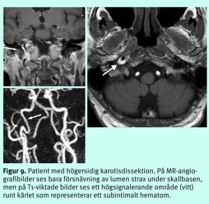 Akuta sjukdomar i halskärlen. Medvetenheten har ökat om att dissektioner i halskärlen är en viktig potentiell orsak till embolisk stroke [11, 12], och om en sådan drabbar arteria vertebralis intradurala segment kan den någon gång vara orsak till subaraknoidalblödning. Bilder bara av lumens grovmorfologi med MR-angiografi eller DT-angiografi är otillräckligt och kan leda till underdiagnostik. MR med T1- och PD-bilder eller analys av kärlväggens tjocklek och attenuering vid DT är viktiga för att avslöja ett subintimalt hematom (Figur 9). Majoriteten av dissektionerna läker inom ett par månader. Relativt stor enighet råder om att en uppföljande undersökning med någon av de dessa modaliteter, eller doppler, cirka 3 månader efter debuten är värdefull för att eventuellt kunna avsluta den antikoagulantiabehandling som är gängse.