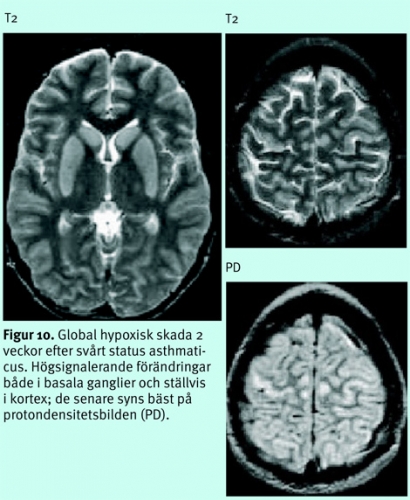 Sedan decennier vet vi att skador av global ischemi ibland kan visualiseras med DT subakut och att de vanligen blir tydligare efter 3–4 dagar. Diffusionsviktade bilder är ett betydligt känsligare instrument för att påvisa globala hypoxiska/ischemiska förändringar, men den kliniska nyttan är ofta begränsad. Radiologen kan sällan infria intensivvårdsläkarens förhoppningar om säker prognostisk information om huruvida ett permanent vegetativt tillstånd är att vänta, eftersom någon entydig gräns mellan förändringar som kan vara förenliga med återhämtning och irreversibla skador inte finns, inte ens med denna teknik. Utbredda, kraftiga förändringar i basala ganglier kan dock ge en fingervisning om ett dåligt neurologiskt utfall.