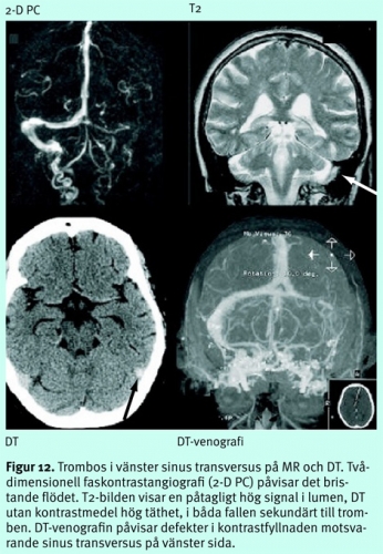Inte sällan får flera tekniker kombineras för att få en konklusiv tolkning. Konventionella MR-bilder bidrar här, eftersom MR dels har god känslighet för sekundära förändringar som ödem eller hemorragiska lesioner orsakade av stas, dels ibland visualiserar själva trombmassorna eller abnorma signaler i kortikala vener (Figur 12). Vid DT utan kontrastmedel är det jämförelsevis svårare att detektera tromber (täthet högre än vad som svarar mot den normala hematokriten) och påvisa ödem. DT-venografi under kontrastinjektion ger en bättre diagnostisk säkerhet än MR, eftersom metoden besväras av färre tekniska svårigheter och fallgropar än MR. DT kombinerad med DT-venografi kan därför komma att etablera sig som första linjens diagnostik vid misstänkt sinustrombos, särskilt som tillgången till MR under jourtid på många håll är dålig.