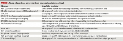 Det förefaller därför vara på sin plats att överblicka den arsenal av neuroradiologisk metodologi som snabbt växt fram och reflektera över dess kliniska användning. För att underlätta läsningen presenteras den vildvuxna flora av ständigt nya akronymer och förkortningar, som inte bara utväxlas radiologer emellan utan också ofta ger röntgenutlåtanden en air av tekniskt fikonspråk (Tabell I).