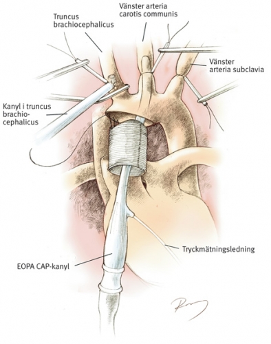 Efter standardiserad anestesi utförs kirurgin via en median sternotomi. Blod dräneras till hjärt–lungmaskinen genom kanylering av vena cava superior och vena cava inferior. För arteriellt återflöde från hjärt–lungmaskinen kanyleras truncus brachiocephalicus direkt med en 18F eller 20F DLP-artärkanyl (Medtronic Inc, Minneapolis, Minnesota), vilken därmed kan användas både för helkroppsperfusion och för selektiv antegrad hjärnperfusion (Figur 2). Vena brachiocephalica delades i dessa fall inte, eftersom åtkomsten av halskärlen var acceptabel. Kall blodkardioplegi ges för att skydda hjärtat, och patienten kyls till en central temperatur på 25 °C uppmätt i trumhinnan. Alfa-stat-strategi används vad gäller monitorering av blodgaser.