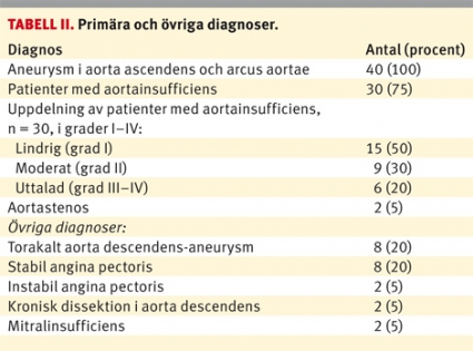 Totalt 40 patienter opererades med rekonstruktion av arcus aortae med användning av tryckkontrollerad bilateral selektiv antegrad hjärnperfusion under moderat hypotermi. Medianåldern var 68 år (61–75 år); 19 patienter (48 procent) var män, och 6 patienter (15 procent) hade tidigare genomgått öppen hjärtkirurgi. Primära och övriga diagnoser framgår av Tabell II. Proximala arcus rekonstruerades hos 24 patienter (60 procent) och totala arcus hos 16 (40 procent). Aortaklaffbesparande kirurgi och rekonstruktion av aorta ascendens utfördes samtidigt hos majoriteten av patienterna (Tabell III). Kanylering av truncus brachiocephalicus påverkade inte blodtrycket uppmätt i höger och vänster arteria radialis före och efter start av hjärt–lungmaskinen.