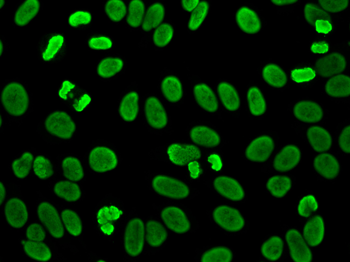 Typisk homogen ANA-färgning, förenlig med anti-dsDNA-antikroppar, med det nya referenspreparatet 15/174. Foto: Stephan Regenass
