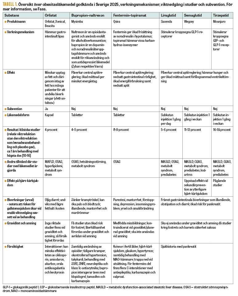Vi har i dag tillgång till sex olika läkemedel för viktreduktionsbehandling; se Tabell 1. Gemensamt för dessa läkemedel är att de ska kombineras med levnadsvanebehandling. Ofta behövs stöd till hållbar förändring av framför allt kosten, och dietistens roll är då central. Kostnaden för patienten är densamma oavsett om läkemedlet förskrivs i primär- eller specialistvården.