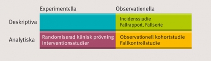 Studiedesignens taxonomi. Förenklat kan kliniska studier delas in utifrån design (Figur 1). En deskriptiv studie är beskrivande. Den avser inte att testa en biologisk/klinisk hypotes, men kan vara instrumentell för att formulera en sådan. Fallrapporter, prevalens- eller incidensstudier är exempel på deskriptiva studier. Analytiska studier avser att mäta ett hypotetiserat orsakssamband mellan en exponering (x) och ett utfall (y), det vill säga att testa en hypotes. De kan i sin tur delas in i interventionsstudier, där exponeringen aktivt fördelas bland studiepersonerna, och i observationella studier, där fördelningen av exponering inte styrs av studieledarna.