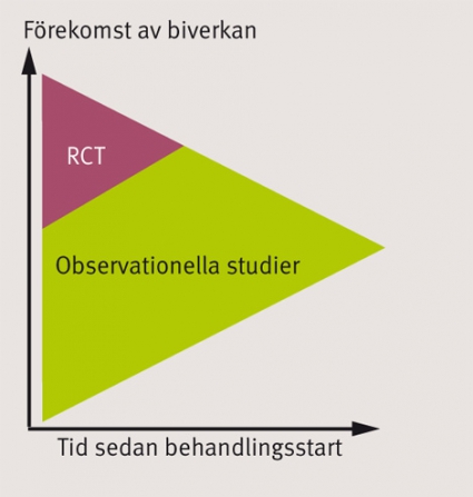 Observationella studier. Observationella studier, i synnerhet om de baserar sig på redan existerande datakällor som till exempel register, möjliggör större studiepopulationer och längre uppföljningstider och därmed förbättrade möjligheter att identifiera och kvantifiera ovanliga men allvarliga biverkningar även efter lång tid (Figur 2). De ger också möjligheter att studera mindre selekterade patientpopulationer, liksom det omvända; att specifikt identifiera patientgrupper med vissa karaktäristika som kanske exkluderats från kliniska prövningar. Framför allt ger observationella studier möjlighet att studera läkemedelssäkerhet i den lite vidare bemärkelsen i termer av ändrade mönster av samsjuklighet.