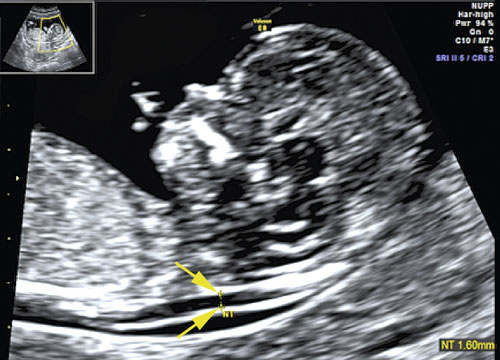 Tidigare hade man i årtionden använt moderns ålder som urvalsmetod för att erbjuda fosterdiagnostik och ge möjlighet till prenatal diagnos av trisomi 21 [2]. Successivt ökande genomsnittsålder hos gravida kvinnor och risk för missfall efter invasiv provtagning har gjort att en sådan policy inte kan anses vara medicinskt försvarbar. Metoden med ultraljud och mätning av fostrets nackuppklarning (NUPP) utvecklades vid Fetal Medicine Foundation vid King’s College i London under 1990-talet (Figur 1). Med en kombination av fostrets nackuppklarning och den gravida kvinnans ålder kunde ca 75 procent av foster med trisomi 21 detekteras om ca 5 procent av de undersökta hade positivt test och erbjöds invasivt prov [3].