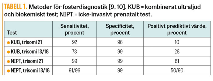 Hittills har man kunnat erbjuda endast invasivt test för att diagnostisera sjuka foster hos de knappt 5 procent som upptäcks ha förhöjd risk. Den invasiva provtagningen kan dock vara associerad med en liten ökad risk för missfall [7]. Numera kan dock samma grupp även erbjudas NIPT, som är ett icke-invasivt test med mycket hög sensitivitet och specificitet (99,9 procent) [8, 9] (Tabell 1).