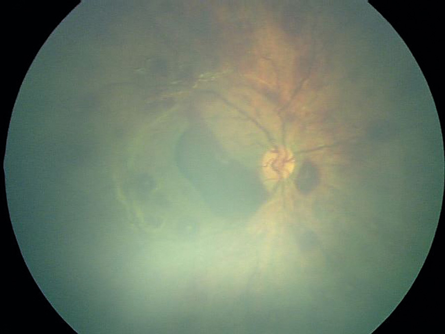 Figur 2. Retinoschis, dvs upplyftad näthinna, hos barn som utsatts för AHT. Runt schisblåsan finns depigmenterade ljusa veck i näthinnan. Intraretinala punktblödningar, som är för många att räkna. Preretinala blödningar.