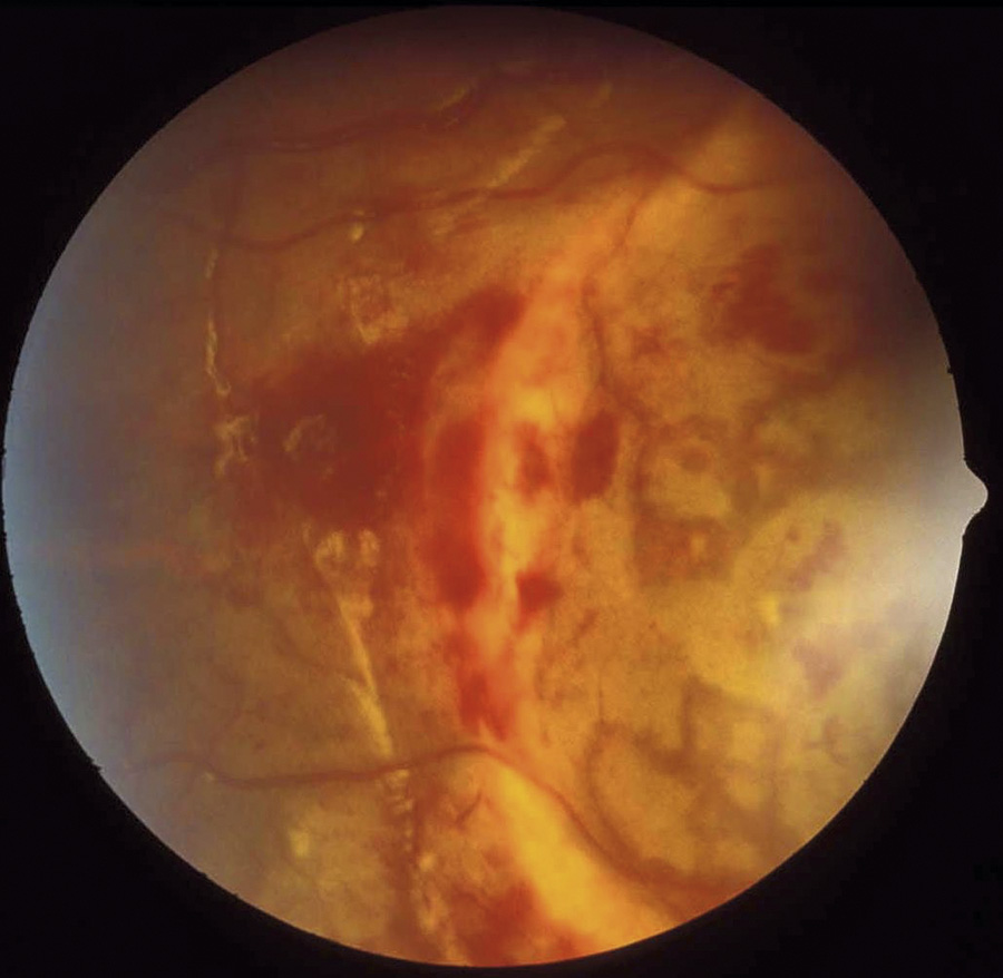 Figur 4. Veckning av näthinnan vid gula fläcken hos barn som utsatts för AHT. Man ser att de större blodkärlen veckar sig över näthinnevecken. Djupa intraretinala blödningar ses.