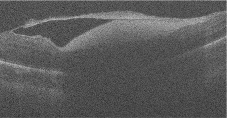Figur 5. Horisontell skanning av centrala delen av makula med handhållen OCT-kamera. Bilden visar en relativt normal näthinna nasalt, en preretinal blödning temporalt och en förtjockad, delvis avlossad glaskroppsyta (hyaloid hinna) posteriort. Med tillstånd från professor Cynthia Ann Toth, MD, PhD, Duke Eye Center, Durham (tidigare publicerad i: Seider MI, Tran-Viet D, Toth CA. Retin Cases Brief Rep. 2016;10(3):283-5).