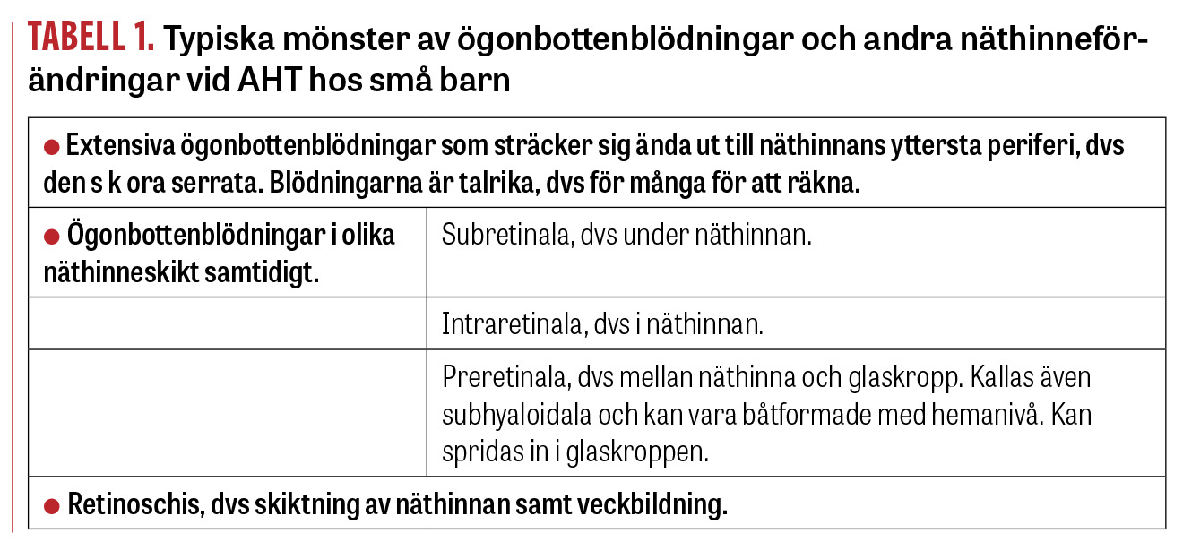En systematisk genomgång av den diagnostiska precisionen av ögonbottenblödningar vid AHT, i jämförelse med accidentella huvudskador, visade att sensitiviteten är 75 procent och specificiteten 94 procent [18]. Retinoschis med veckning av näthinnan (se nedan) förekommer mindre ofta, men har en mycket hög specificitet för AHT [49]. Papillödem har låg specificitet och är ovanligt vid AHT med en förekomst på mindre än 10 procent [18, 47].