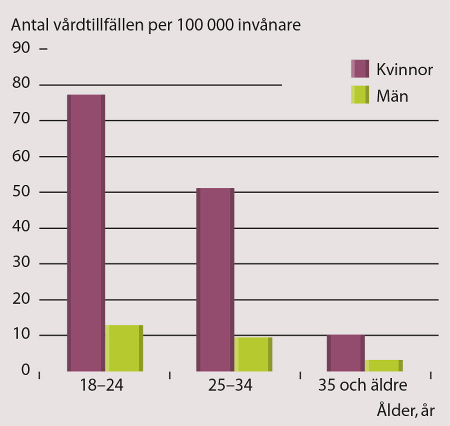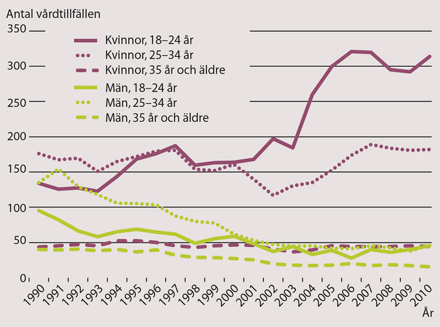 Under perioden ökade antalet vårdtillfällen per 100 000 invånare markant för unga kvinnor (Figur 1). För unga män noterades däremot en svag minskning. Individer över 35 år hade en relativt jämn vårdkonsumtion över åren.