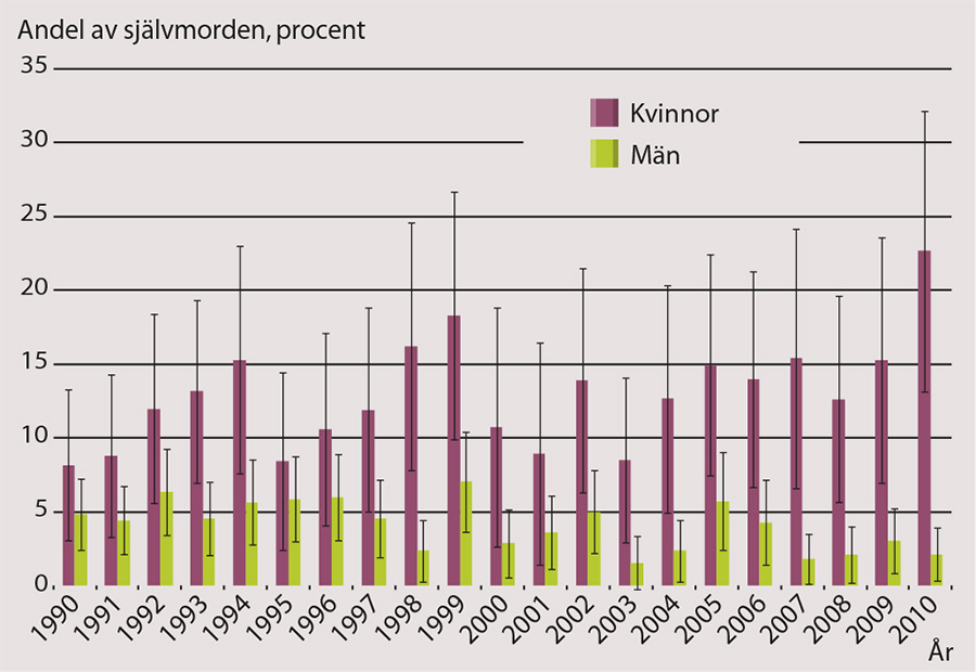 Ur Dödsorsaksregistret erhölls uppgifter om antal avlidna på grund av självmord i åldersgruppen 18–34 år mellan 1990 och 2010. Genom att sedan länka dödsorsaksdata med data från Patientregistret under patienternas sista fem år i livet kunde vårdtillfällen med personlighetsstörning som huvuddiagnos tas fram. Figur 4 visar hur stor andel av alla patienter som begått självmord 1990–2010 som hade slutenvårdats med huvuddiagnos personlighetsstörning åtminstone en gång under de sista fem åren. Kvinnor hade i mycket högre utsträckning vårdats för personlighetsstörning än män under hela tidsperioden. Andelen vårdade fluktuerade över åren; dock verkade skillnaden mellan könen snarare öka än minska. År 1990 hade 8 procent av kvinnorna vårdats jämfört med 23 procent år 2010. Bland män sågs däremot snarare en minskning, från 5 procent 1990 till 2,5 procent år 2010.