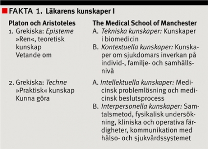 När man för några år sedan beslutade sig för att reformera studieplanen (curriculum) vid The Medical School of Manchester tänkte man grundligt igenom vad studenterna skulle kunna [4] och kom fram till den taxonomi som redovisas i den högra spalten i Fakta 1. I den vänstra spalten finns som jämförelse den »klassiska« taxonomin från Platon och Aristoteles [3].