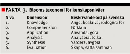 Kognitiva mål. Vanligt är att man för att bedöma kunskaper använder »Bloom´s taxonomy for educational objectives« [6] (Fakta 3). Den publicerades första gången 1956 och har visat sig vara lätt att förstå och använda. Den är hierarkiskt uppbyggd, vilket betyder att högre kunskapsnivåer förutsätter att man först har uppnått de lägre nivåerna. I målbeskrivningar kan den användas till att beskriva »vetande«, dvs kunskapsformerna 1A, 1B och 3A samt delvis 2A i Fakta 1 och 2.