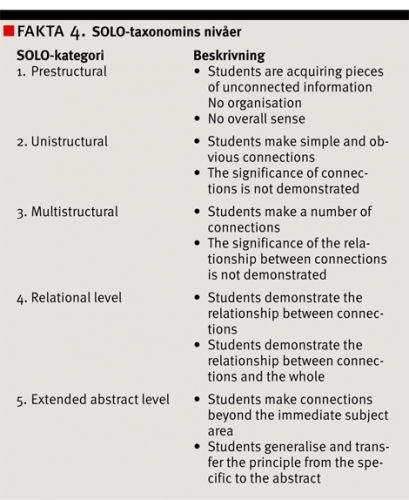 Akronymen SOLO (Structure of the observed learning outcome) står för en vidareutveckling av Blooms taxonomi. SOLO skapades 1982 av Biggs och Collis [8] och innehåller en kvalitativ värdering av studentens kunskaper och tänkande. Kategorierna framgår av Fakta 4.