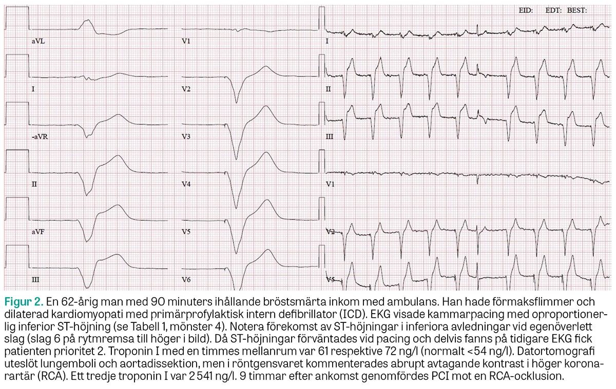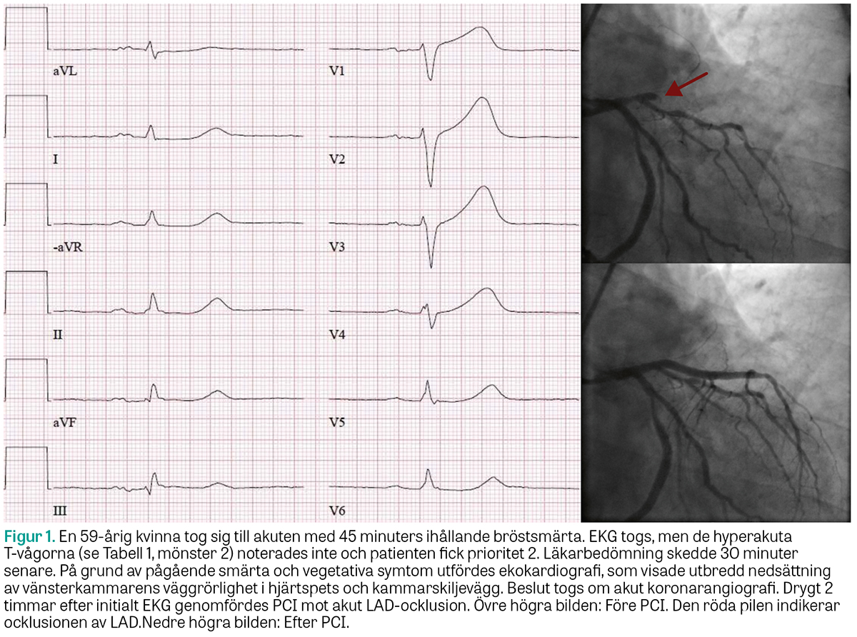 Med tanke på STEMI-begreppets begränsningar har en ny klassificering av infarktpatienter föreslagits där infarkten betecknas baserat på huruvida den har orsakats av akut kranskärlsocklusion eller ej, s k ocklusiv och icke-ocklusiv hjärtinfarkt (occlusion myocardial infarction [OMI] respektive non-occlusion myocardial infarction [NOMI]) [13-17]. Denna definition erbjuder inga strikta EKG-kriterier som vattendelare till omedelbar koronarangiografi, men uppmuntrar till användning av bredare EKG-kriterier i tillägg till ST-höjningar (Tabell 1), hänsyn till kliniska tecken på pågående ischemi och hemodynamisk instabilitet eller användning av ekokardiografi för att påvisa hypokinesier i fall där EKG-förändringarna är subtila. OMI-begreppet är väl förenligt med Europeiska kardiologföreningens rekommendation att ta hänsyn till STEMI-ekvivalenta mönster, men förespråkare av OMI-begreppet menar att ett frångående av ST-höjning som dominerande indikation om akut kranskärlsocklusion öppnar för större möjligheter att ta hänsyn till fler EKG-fynd som talar för akut kranskärlsocklusion [17]. Även om skillnaden till stor del är semantisk, kan en akut kranskärlsocklusion vid användning av STEMI/NSTEMI-begreppet riskera att tidigt klassificeras som NSTEMI om STEMI-kriterier ej uppfylls. Det är viktigt att påpeka att EKG-kriterierna för OMI utan typisk ST-höjning måste bedömas i sitt kliniska sammanhang och därför inte är applicerbara i avsaknad av symtom förenliga med akut kranskärlsocklusion. I Figur 1 och 2 presenteras två fall med OMI, men negativa STEMI-kriterier, där revaskularisering försenats. Fall 1 beskriver en 59-årig kvinna med 45 minuters ihållande bröstsmärta. EKG saknade ST-höjningar, men hyperakuta T-vågor förelåg. På grund av avsaknad av ST-höjning dröjde läkarbedömning. Drygt 2 timmar senare genomfördes PCI mot en akut LAD-ocklusion. Fall 2 beskriver en 62-årig man med förmaksflimmer, dilaterad kardiomyopati och pacemaker som inkom med ambulans på grund av ihållande bröstsmärta. EKG visade visserligen ST-höjningar, men då ST-höjningar förväntades vid pacing och delvis fanns på tidigare EKG skedde ingen akut åtgärd. 9 timmar efter ankomst genomfördes PCI mot en RCA-ocklusion.