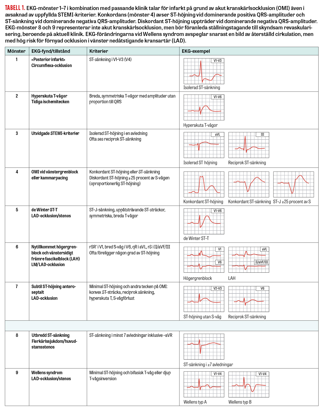 EKG-baserad klassificering av akut hjärtinfarkt har ändrats över tid. Innan revaskularisering var ett alternativ baserades den på förekomst eller avsaknad av Q-vågor [1]. Efter att de stora trombolysstudierna på 1990-talet visade överlevnadsvinst vid akut hjärtinfarkt fanns ett behov att ändra klassificeringen för att passa indikationerna för behandling. Störst överlevnadsvinst sågs vid förekomst av ST-höjning [2], och det nya begreppet ST-höjningsinfarkt (STEMI) och icke-ST-höjningsinfarkt (NSTEMI) gav en tydlig vägledning om vilka patienter som omedelbart bör behandlas med trombolys eller perkutan kranskärlsintervention (PCI) [3]. STEMI-begreppet bygger på uppfyllandet av specifika EKG-kriterier (STEMI-kriterier): minst 1 mm ST-höjning ska föreligga i minst två anatomiskt intilliggande avledningar, till exempel aVF och III. För V2 och V3 finns ålders- och könsspecifika kriterier (kvinnor: >1,5 mm; män <40 år: >2,5 mm; män ≥40 år: >2 mm) [3, 4]. STEMI-begreppet är dock behäftat med svagheter. Förekomst av ST-höjning är inte synonymt med akut kranskärlsocklusion, utan kan exempelvis förekomma även vid perikardit, tidig repolarisation, vänsterkammarhypertrofi etc [5], men framför allt är sensitiviteten för akut kranskärlsocklusion hos STEMI-kriterierna låg [6-8]. Drygt 25 procent av infarkter klassificerade som NSTEMI har visat sig vara orsakade av akuta kranskärlsocklusioner, och dessa är associerade med en sämre prognos [9, 10]. Förloppet vid en akut kranskärlsocklusion är också ofta dynamiskt, och vid tillfällig regress av trombmassan i det påverkade kranskärlet kan ST-höjningar saknas. Förekomst av ST-höjning är också beroende på infarktens lokalisation. Exempelvis kan en bakväggsinfarkt visa sig endast som ST-sänkningar i V1–V3, se Tabell 1 [11]. Akut kranskärlsocklusion kan också förekomma utan ST-höjning tack vare betydande kollateralutveckling [12], vilket påverkar EKG-kriteriernas sensitivitet negativt. Vidare är STEMI-kriterier inte applicerbara vid vänstergrenblock, kammarpacing eller vänsterkammarhypertrofi [4].
