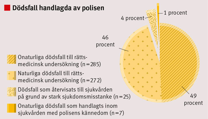 Cirka 95 procent av de polisanmälda dödsfallen i de tre studerade länen genomgick rättsmedicinsk undersökning när sådan var indicerad. Det förefaller rimligt att polisen har möjlighet att till sjukvården återvisa vissa dödsfall, dvs resterande 5 procent, eftersom även naturliga dödsfall kan inträffa under omständigheter som föranleder polisanmälan. Polisen åläggs i varje enskilt fall, eventuellt efter konsultation med rättsläkare, att bedöma om dödsfallet kan anses naturligt eller onaturligt, och har möjlighet att avstå från rättsmedicinsk undersökning om det inte föreligger skäl för sådan [1, 3, 4]. Vid de dödsfall som i studien inte gick vidare till rättsmedicinsk undersökning innefattade polishandlingarna i de flesta fall stark sjukdomsmisstanke. I sådana fall är det korrekt av polisen att låta dödsfallet utredas inom sjukvården.