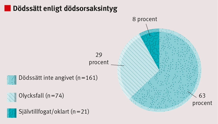 På de dödsorsaksintyg som handlagts av sjukvården saknades uppgift om dödssätt i 63 procent (n = 161), medan dödssättet angetts som »olycksfall« i 29 procent (n = 74). I resterande intyg (n = 21; 8 procent) hade dödssättet angetts som »självtillfogat« eller »oklart« (Figur 3). Andelen intyg som utfärdats efter klinisk obduktion understeg 5 procent i alla tre län (n = 11).