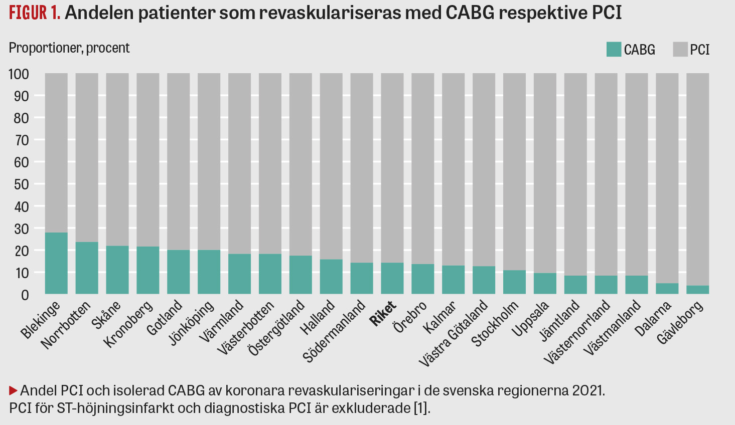 En annan intressant fråga som Rashid och medförfattare väcker är om, och i så fall hur, hjärtronders organisation och genomförande påverkar hur många patienter som behandlas med PCI respektive CABG i olika regioner i Sverige. Det finns väldigt stora, närmast oförklarliga, skillnader i landet mellan andelen patienter som revaskulariseras med CABG respektive PCI [1]. Andelen patienter som revaskulariseras med CABG varierar från 4–5 procent i Dalarna och Gävleborg, där Uppsala är närmaste toraxkirurgiska klinik, till över 20 procent i Skåne, Blekinge och Norrbotten (akut ST-höjningsinfarkt och diagnostisk PCI exkluderade), se Figur 1. Differensen kan inte förklaras av skillnader i patientmix utan beror på beslut fattade av enskilda behandlande läkare och/eller beslut på hjärtronder. På större sjukhus med både interventionell kardiologi och toraxkirurgi genomförs ofta dagliga hjärtronder, medan PCI-enheter utanför sjukhus ofta har hjärtronder med toraxkirurger endast någon gång per vecka. Det är oklart om tillgången till hjärtronder påverkar besluten om revaskulariseringsmetod, men om så är fallet bör organisationen ses över. Även de toraxkirurgiska klinikerna har förstås ett ansvar att följa behandlingsrekommendationer och erbjuda CABG till patienter med indikation.