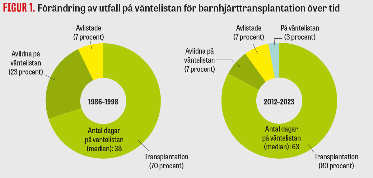 Ökningen av antalet transplantationer förklaras endast delvis av att listningsincidensen stigit över tid. Till största delen beror ökningen på att fler barn som sätts på väntelistan för ett nytt hjärta i Sverige når transplantation [3]. Utvecklingen av mekaniska hjärtpumpar för akut och långvarigt cirkulationsstöd, förbättrad pre- och postoperativ intensivvård, implementeringen av ABO-inkompatibel transplantation och utveckling av nya metoder för att begränsa preoperativ HLA-immunisering anses vara några av de faktorer som bidragit till kraftigt förbättrad överlevnad på väntelistan de senaste 15 åren, trots att väntetiden för ett nytt hjärta blivit längre i Sverige över tid.