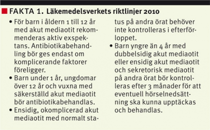 Enligt de nya rekommendationerna för behandling av akut mediaotit som utarbetats i Sverige år 2010 [16] ska man vid akut mediaotit primärt avstå från antibiotikabehandling av patienter mellan 1 och 12 år (Fakta 1). Undantag är barn med komplicerande faktorer (Fakta 2) och barn med recidiverande otiter. Vid dessa undantag föreligger egenskaper hos antingen infektionen eller patienten, som erfarenhetsmässigt talar för att det finns ökad risk för komplikationer eller för dålig utläkning.