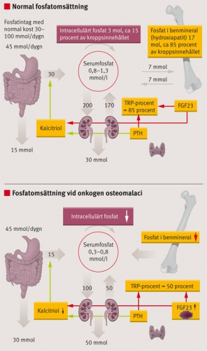 En FGF23-producerande tumör orsakar negativ fosfatbalans på grund av hyperfosfaturi samtidigt som kalcitriolaktiveringen hämmas, vilket beskrivs schematiskt i den nedre bilden i Figur 1. Följden blir förlust av fosfat från benmineral och intracellulärrum, vilket leder till frakturer och muskelsvaghet hos patienten.