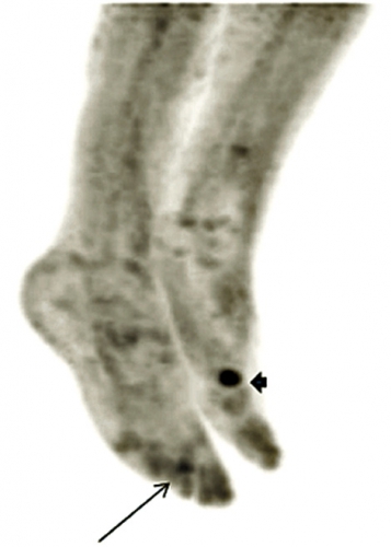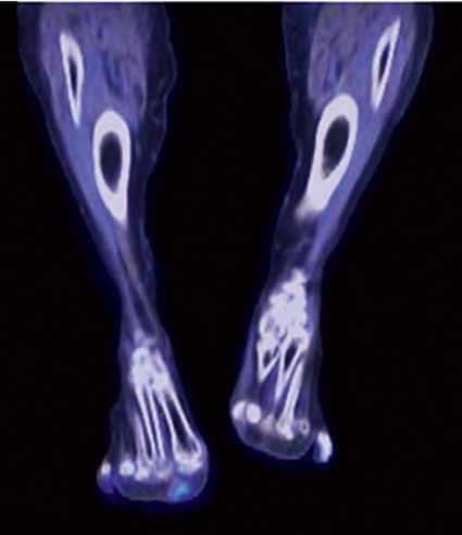 Patienten som beskrevs inledningsvis hade förhöjt FGF23, 90 ng/l (referensvärde 10–50 ng/l), och hon genomgick en venkatetrisering där en klar gradient påvisades från höger ben. Därefter undersöktes benet med MR och oktreotidskintigrafi utan något klart fynd. Upprepad katetrisering kunde påvisa en gradient så distalt man kom i höger nedre extremitet, och FDG-PET kunde därefter påvisa ett fokalt upptag i framfoten (Figur 2). En liten tumör av typen PMT-MCT avlägsnades, fosfatmetabolismen normaliserades, och patientens kliniska tillstånd förbättrades dramatiskt under de närmaste månaderna.