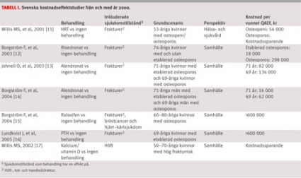 I Sverige har ett antal kostnadseffektstudier av osteoporosbehandlingar utförts de senaste åren [1]. I Tabell I sammanfattas alla publicerade studier från och med år 2000. I de sju studierna utvärderades bisfosfonater i tre och hormonell substitutionsterapi (HRT), raloxifen, paratyreoideahormon (PTH) och kalcium/vitamin D i en vardera. Kostnaden per vunnet QALY i grundscenarierna i de sju studierna varierar mellan kostnadssparande (dvs ena behandlingsalternativet ger bättre effekt och lägre kostnader) och ca 600000 kronor.