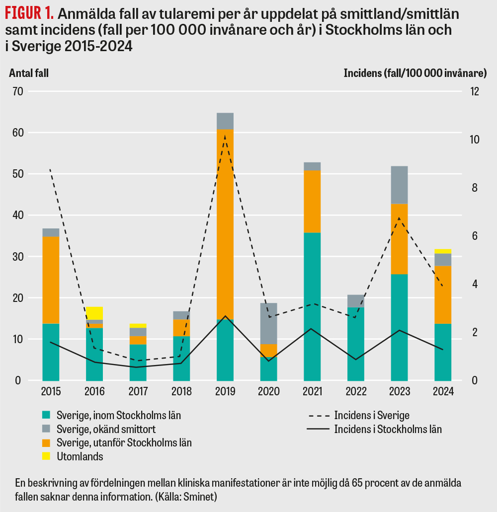 Antalet anmälda humanfall fluktuerar över tid med oregelbundna intervaller; orsaken är inte helt klarlagd, men sannolikt föreligger en komplex samverkan mellan faktorer, som förekomsten av olika värddjur, insektsvektorer, ekologi och klimatfaktorer [3, 7]. Toppåret 2019 i Sverige sammanföll med gynnsamma omständigheter för myggpopulationen [10]. I Region Stockholm anmäldes 325 fall under åren 2015–2024, med ett genomsnitt på 33 fall per år och en medelincidens på 1,34/100 000 individer per år. Av samtliga rapporterade fall i Region Stockholm hade 98 procent (320/325) smittats inom Sverige. Bland de fall där smittorten inom landet var känd hade 57 procent (160/282) smittats inom Stockholms län. Smitta rapporterades från 18 av länets 26 kommuner (Figur 1). Sedan 2021 har antalet rapporterade fall med angiven smittort inom Stockholms län visat en ökande trend.