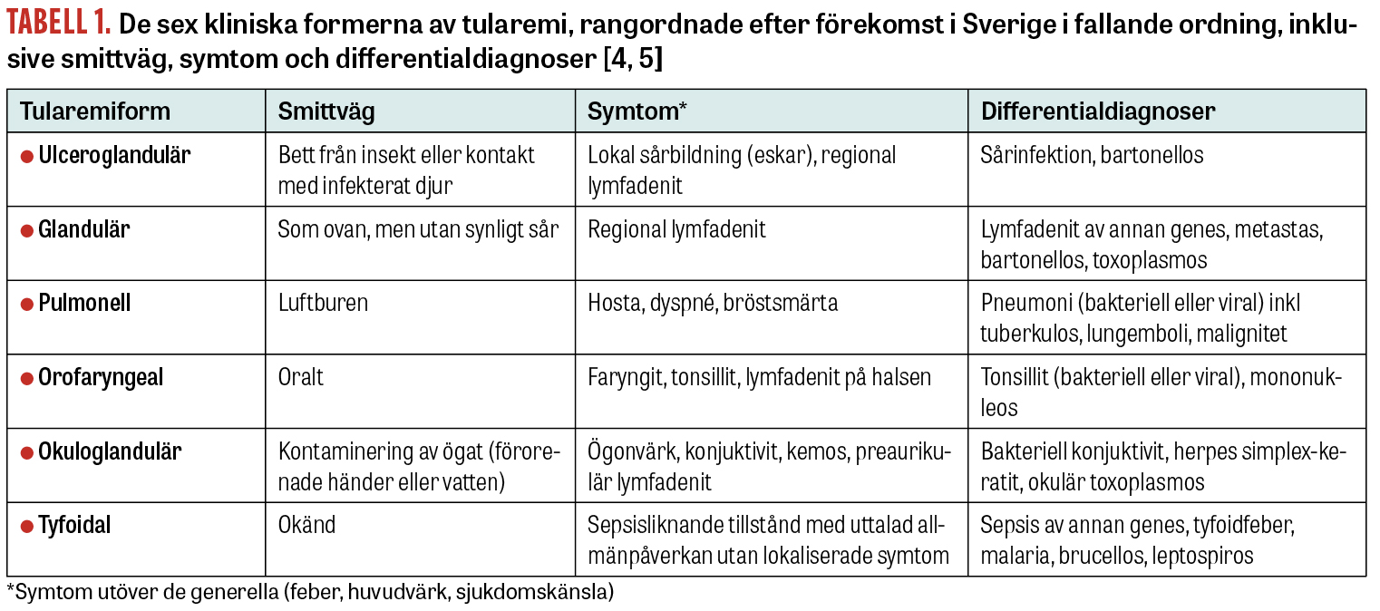 Generella symtom vid tularemi är hög feber, huvudvärk och sjukdomskänsla, som tillstöter efter en inkubationstid på 2–10 dagar. Den kliniska bilden ser olika ut för de sex olika sjukdomsformerna, som har varierande smittvägar och symtom och olika differentialdiagnoser (Tabell 1). Vid den ulceroglandulära formen, som är vanligast i Sverige, uppstår ett sår (eskar) där man blivit insektsbiten, följt av regional lymfadenit som utan behandling kan växa och rupturera [4, 5].