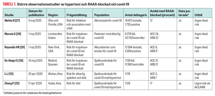 Sammantaget saknas ännu resultat från randomiserade kontrollerade studier som kan visa om läkemedel som kan blockera RAAS är skyddande, neutrala eller potentiellt skadliga vid smitta med sars-cov-2 eller vid etablerad covid-19. Det har dock nyligen publicerats flera välgjorda observationsstudier som visar neutral effekt av att stå på ACE-hämmare eller ARB vid insjuknandet i covid-19, sammanfattade i Tabell 1. Två stora studier från USA och en från Italien visade ingen association med ökad risk för insjuknande för patienter som stod på RAAS-blockad, efter justering för samsjuklighet och riskfaktorer [27-29]. En stor kinesisk studie visade inte heller någon association med ökad risk för allvarlig covid-19 eller död hos sjukhusvårdade covid-19-patienter [15]; i ytterligare en kinesisk studie rapporterades lägre mortalitetsrisk för patienter med pågående RAAS-blockad [23]. En spansk studie visade ingen association med ökad risk för sjukhusvård eller död, och i en subgruppsanalys sågs lägre risk för patienter med diabetes mellitus med RAAS-blockad [16].