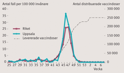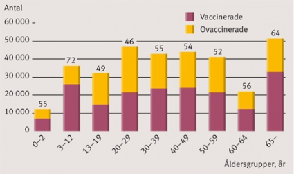 Vid epidemins kulmen i vecka 46 hade närmare 100 000 doser distribuerats och riskgrupper samt barnfamiljer blivit vaccinerade (Figur 1). Fram till första veckorna i januari 2010 hade 250 000 doser distribuerats och ca 190 000 personer vaccinerats. Situationen i Uppsala län liksom i den nationella vaccinationskampanjen visade att vaccinationstäckningen i yngre åldersgrupper som saknade immunitet mot den nya influensatypen var lägre än i åldersgruppen ≥65 år (Figur 2). För 49 personer fanns uppgift om vaccination före insjuknandet, och 46 av dem hade insjuknat mindre än en vecka efter vaccinationen. Tre personer insjuknade tre veckor eller senare efter vaccinationen.