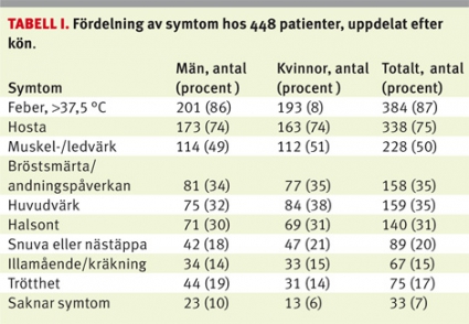 Majoriteten av de insjuknade var yngre personer med en genomsnittsålder på 28,4 år (SD 17,4; median 25,0), 39 procent var 19 år eller yngre och endast 2 procent var 65 år eller äldre. Det fanns inga signifikanta skillnader mellan andelen kvinnor och andelen män som insjuknade (48,4 respektive 51,4 procent). Sjukdomsbilden var ofta lindrig och skilde sig inte från den vid vanlig säsongsinfluensa. Feber, hosta, och ledvärk var de vanligaste symtomen (Tabell I). Hos patienter under 19 år noterades kräkningar och diarré i fler fall (22 procent) än hos patienter ≥19 år (12 procent). 7 procent saknade symtom, vilket kan bero på att symtomfria influensasmittade blev provtagna i samband med smittspårningen.