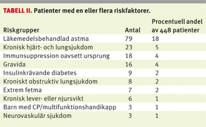 35 procent tillhörde en eller flera definierade riskgrupper (Tabell II). Inga signifikanta skillnader avseende antal sjukdomssymtom hos riskgruppen jämfört med övriga patienter upptäcktes (Tabell III). Fem (3,4 procent) personer från riskgruppen och 21 (7,3 procent) utan risktillhörighet saknade sjukdomssymtom.
