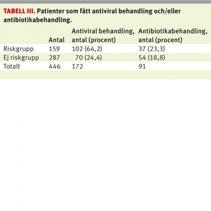 Totalt behandlades 172 patienter (39 procent) med antivirala medel (oseltamivir), och av dessa tillhörde 64 procent minst en riskkategori jämfört med 24 procent för övriga patienter (Tabell III). Antiviral behandling påbörjades i genomsnitt 3,1 dagar efter symtomdebuten (SD 2,4; median 3,0 dagar) och för 48 procent inom 48 timmar. Antibiotikabehandling gavs till 23 procent av riskpatienterna och till 19 procent av dem utan risktillhörighet.
