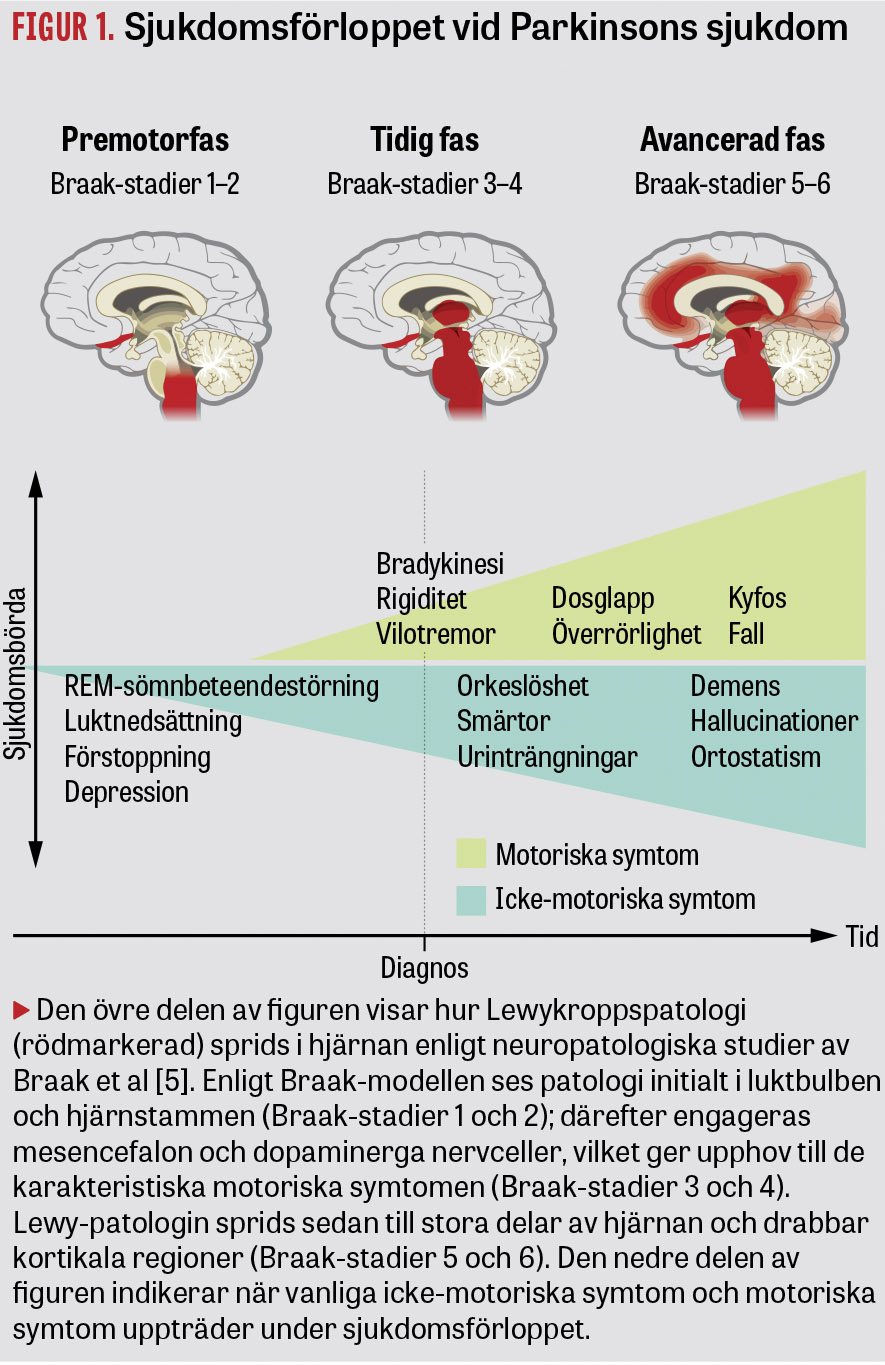 En rad icke-motoriska symtom, såsom REM-sömnbeteendestörning (REM sleep behavioral disorder, RBD), nedsatt luktsinne, förstoppning, depression och ångest, kan föregå de motoriska symtomen (Figur 1).