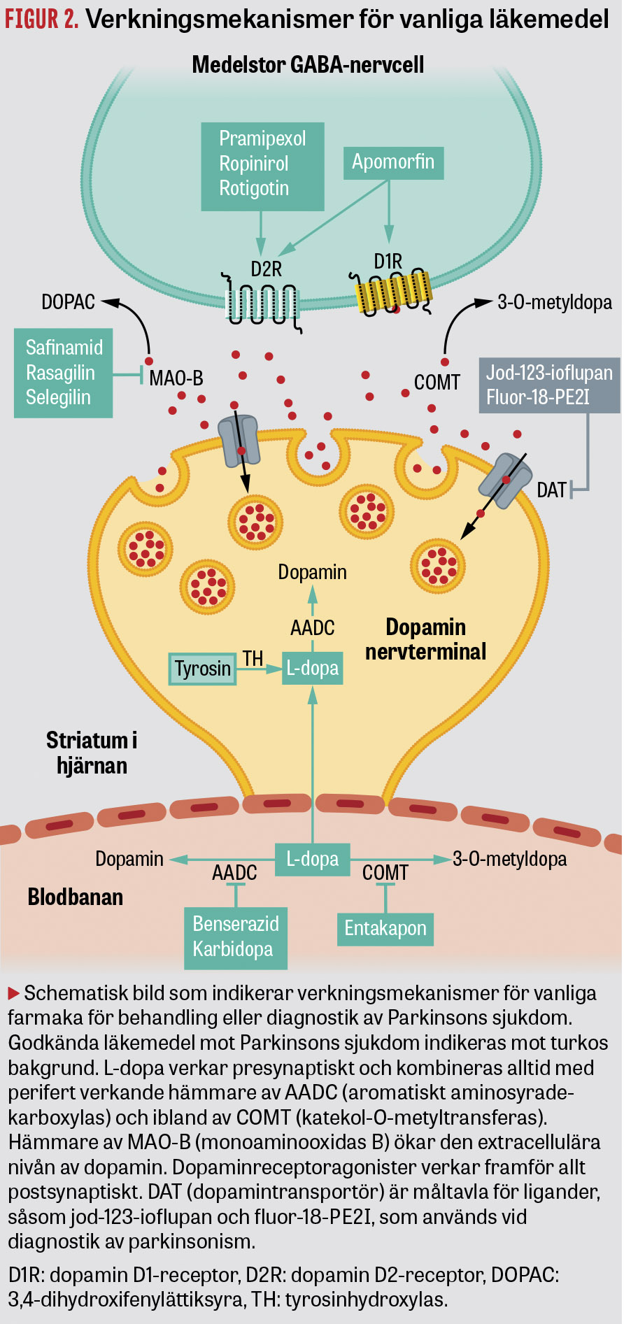 Behandling i tidig fas. Läkemedel som ökar dopaminsignalering är centrala för behandlingen. Dessa läkemedel inkluderar levodopa, dopaminreceptoragonister samt hämmare av monoaminooxidas B (MAO-B) eller katekol-O-metyltransferas (COMT) [7, 8, 14] (Figur 2).